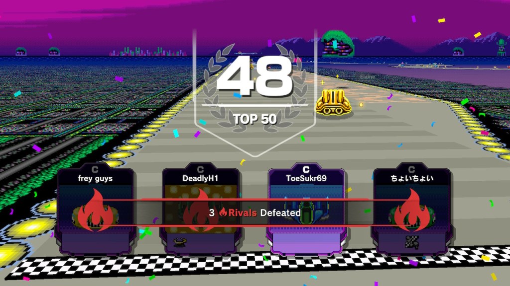 What really puts the game forward are the things you do during the match rather than the outcome. It’s pretty satisfying knocking another player into the side barrier to see that big KO splash pop up knowing they’ve been knocked out of the race. Every match gives you a set of rivals to try and beat, and I found more enjoyment in targeting my rivals to KO and trying to rank them out as opposed to the other 95 players in the match.