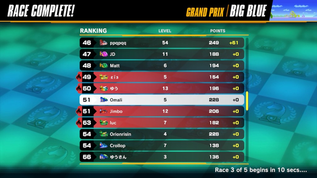 The base 99 player mode is a single race with 99 players. There is a rotating cast of special modes that get you faster progress to tickets, including team modes and one where it’s simply harder maps all the time. Everyone votes for goddamn Port Town II. The tickets you want to collect to spend on entering into the Grand Prix mod, and more on that later.