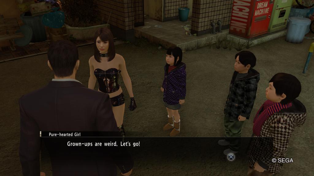 Yakuza has its touch of crazy, and I’m not a prude, but maybe they could have left out the scene where Kiryu and a dominatrix act out a roleplay session in front of a group of confused children at the local park.
