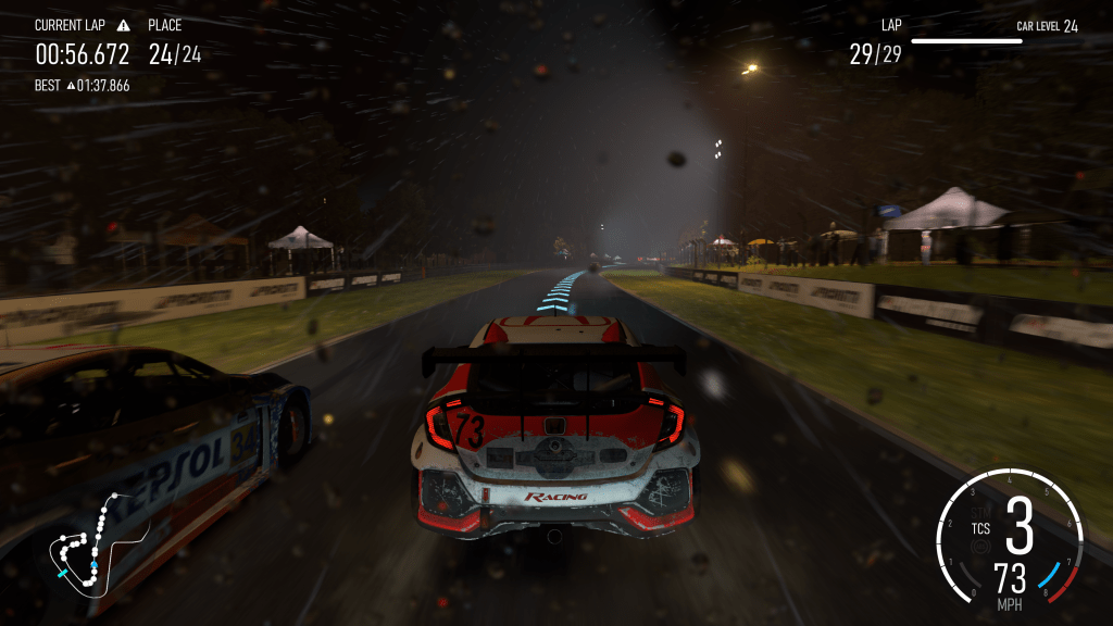 What chews my ass on Forza Motorsport is that the AI cheats in a few very obvious and shitty ways. AI cars are not affected by the environment in the same way your car is, and they are definitely not affected by rain. What this means is that if you’re on a map that has heavy downpour, you are slowly and gingerly taking turns, taking forever to speed up and slow down, and watching the AI zip by like nothing is wrong. I ended the 20th of 29 laps in the map in first place before the rain hit. By lap 23 I was in 24th place, by lap 25 I had been lapped, and by lap 28 I had been lapped twice.